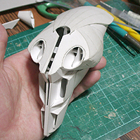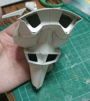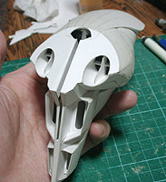 がっぽり開いた口の中に、海水取り込み口とコクピットがあります。立体が難しすぎて、何から手をつけていいかわかりません。パテで作れば、そのつど調整して最終的に形になればいいけど、板の配置で作るのは、頭の中がコンガラがってしまいます。