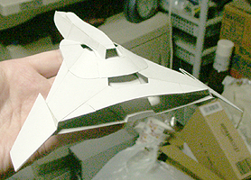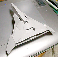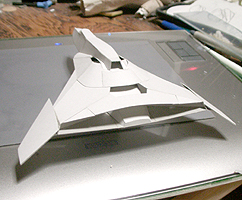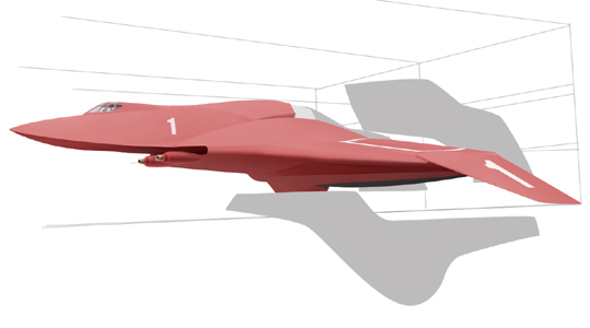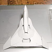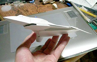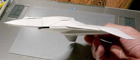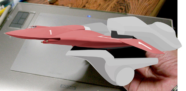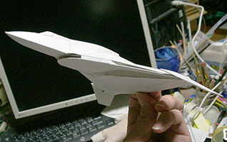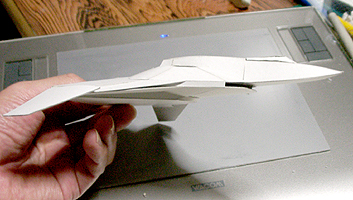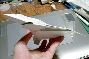 通常ショットはこれで決着をつけます。元の模型のバランスを見ても、他のアングルからのデザインを見ても、たぶんこれが正解です。他のアングルに比べて機首の寸詰まり感がありますが、模型のシルエットから見て、現実がこうなのでしかたないです。