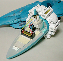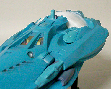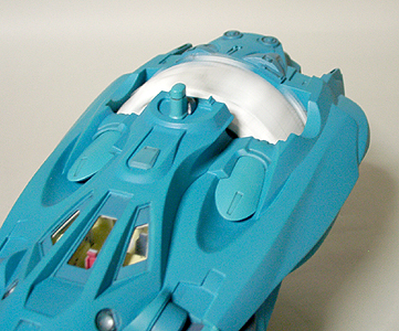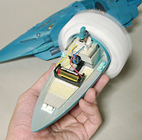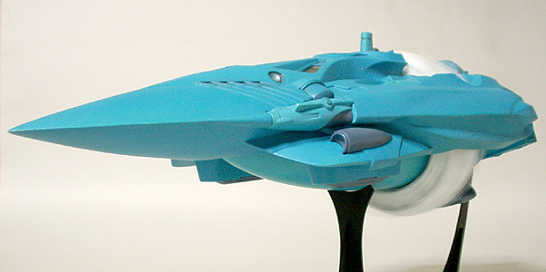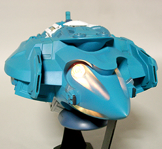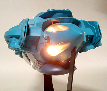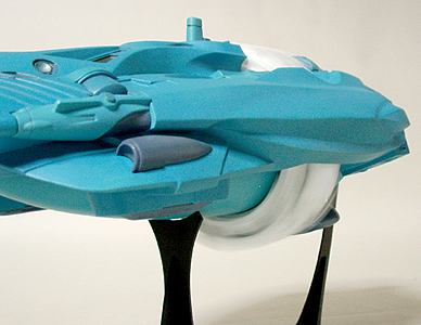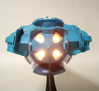 本当は発光部をLEDでやる予定でしたが、単品価格が高かったのであきらめました。設定では推進器であるもののジェットエンジンではないので炎が出ているわけではありません。イメージでは、無色の光か青白い光で考えていました。スピードによって色を変えてもいい気がします。 |