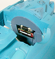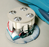 後部エンジン発光ギミックです。単五電池2本を使用してニップル球(豆電球)4つを光らせています。こちらは画像通りの光量を発しています。肉眼で直視できません。外部にスイッチを設けるのが作業上難しくユニットとしました。一度船底とホイールを外して発光スイッチを入れることになります。