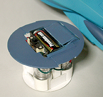 | モーターの駆動部はミニ四駆のオモチャのものを使っています。単五電池1本で動かしています。スイッチは船体の上部にあるアンテナ状のものを前後にすることでON、OFFにします。 |