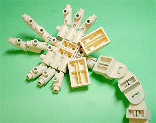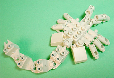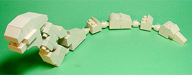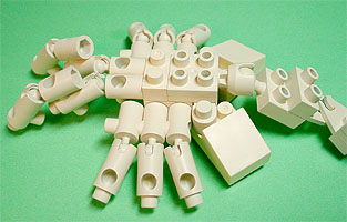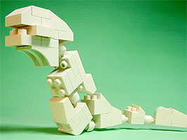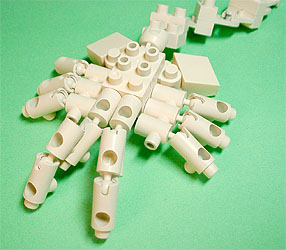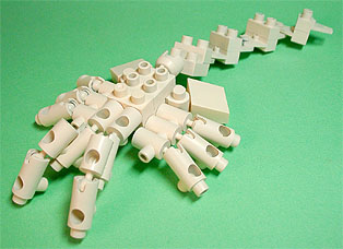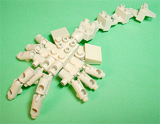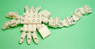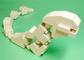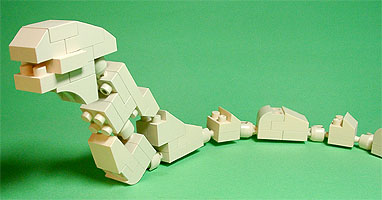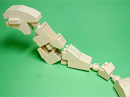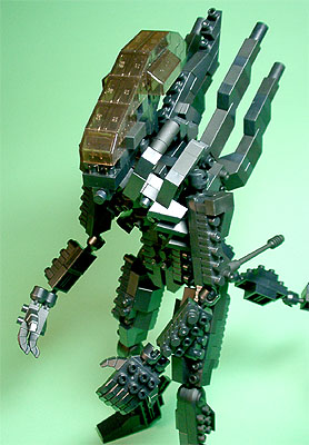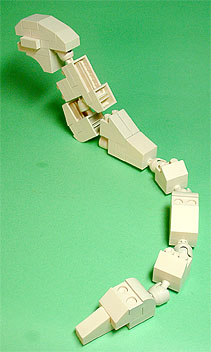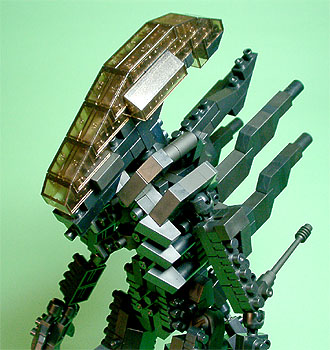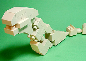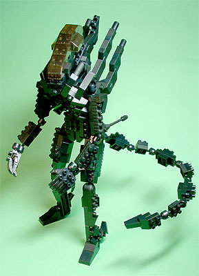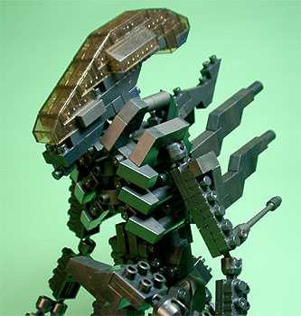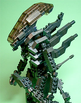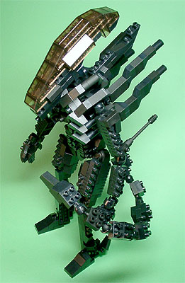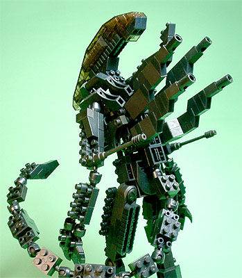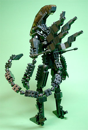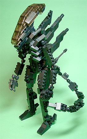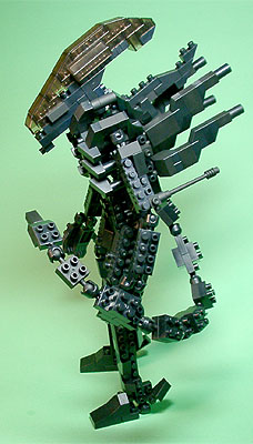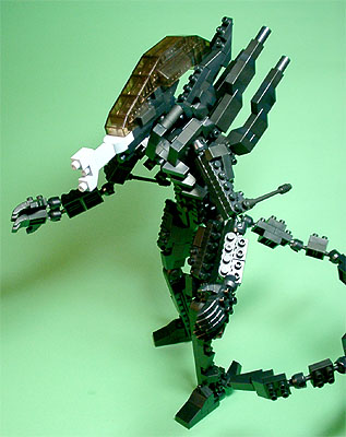 版権ものシリーズ最後のキャラクター。エイリアンから 成体ビッグチャップです。 ロボット、メカが主体のダイヤブロック作例においては 珍しい生ものを選択してみました。 キャラクターチョイスはシリーズ中から第一作目の初代 エイリアンです。 全高は34.5センチ、大型関節は4つ使用しています。 頭部クリアーパーツはDヘッドのクリスタルバージョ ン1個でパーツは揃います。横の目らしきものは本来 目立って欲しくないところなのだが塗装したパーツとの 色の差が目に付きいかにも目、といっ感じになっしまっ たのが残念です。 胸のアバラは今回のエイリアンの売りにもなっているが、 以外にも制作当初から出来ていて比較的簡単に表現 出来たところです。 背中の煙突は胴体との接続ポイントに苦労しました。この 接続方法は強度と角度が必要なアニメロボットの大きな ブロックのウイングなどに応用出来そうです。 |