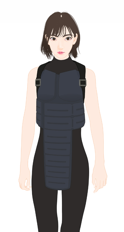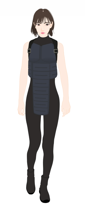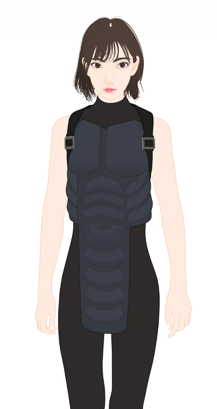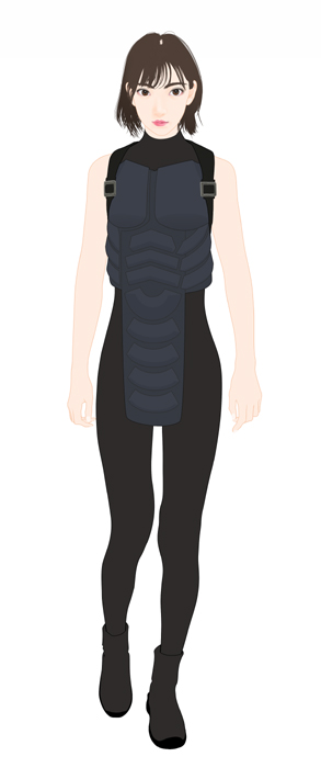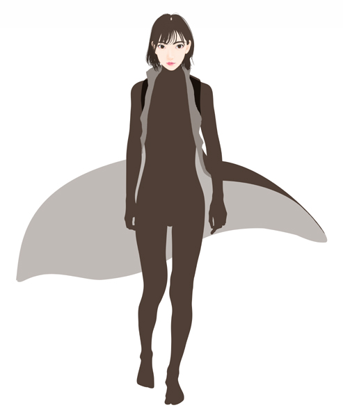 パッと見た目には、ただのファッションになっていますが、静と動とキャラクターを画面の中で表現したときに映えるかたちにはしています。