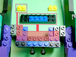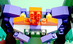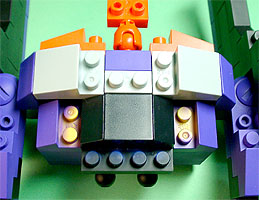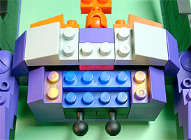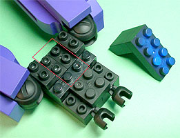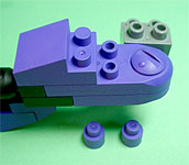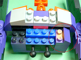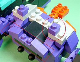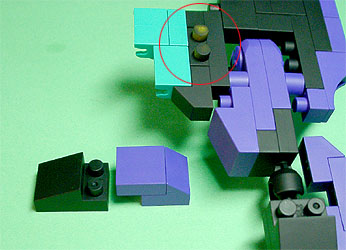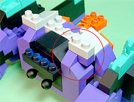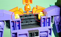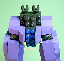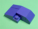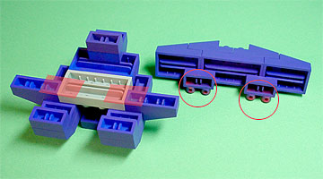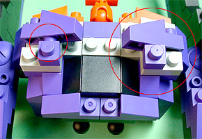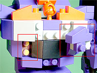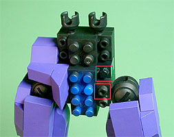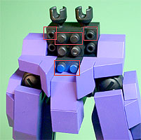胸の中央にパープル色のフタパーツを被せます。右写真のパーツを両側に。