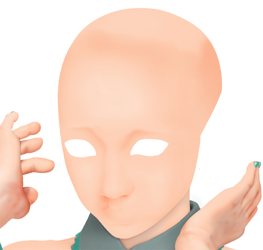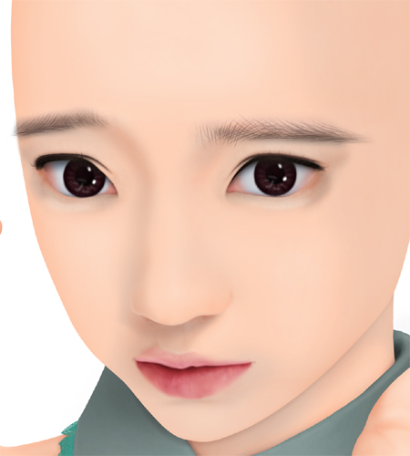 まずは基本的な部分のカゲ処理です。このあと髪の毛の接地部分や髪の掛かるところのカゲ、外部からの照り返し、ホホの赤味、肌の質感等の処理を施します。 |