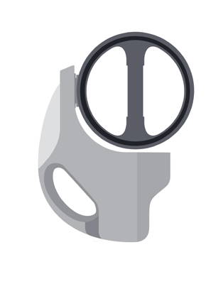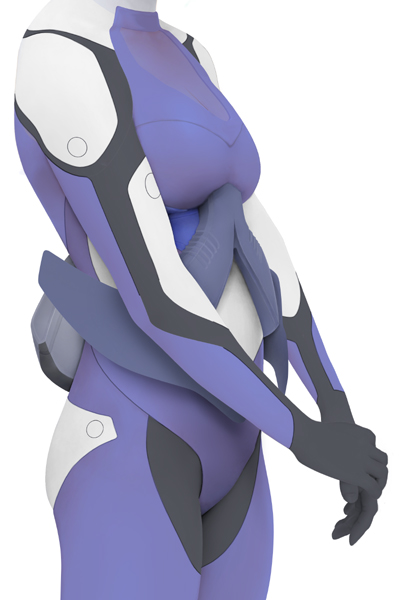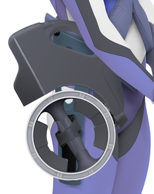 左の装備は腕を通して持ちます。上部をスライドさせてセット完了です。先端の3つの模様は光っていて、先端からビームです。