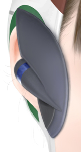 通信機です。耳の裏側に引っ掛けとフードを挟み込んで固定しています。
