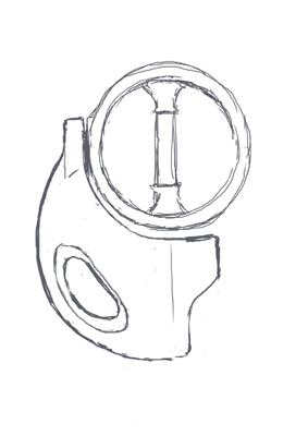 ディスプレイ画面を大きくしようと腕時計より大きく描いたが、今考えると、画面を横にしてスマホを腕の上におくデザインにすればよかったんですね。ダイバーズウォッチの変わりとして考えていたもので。 |
