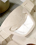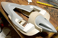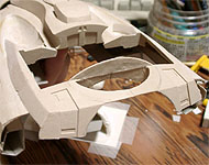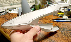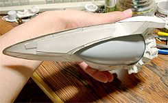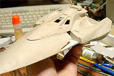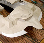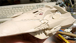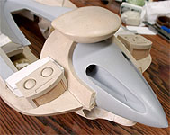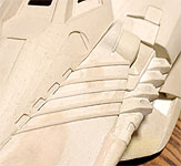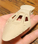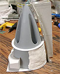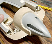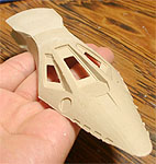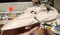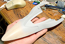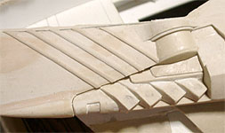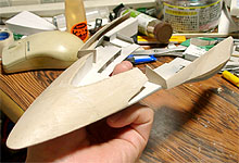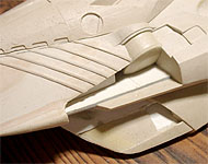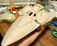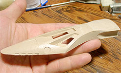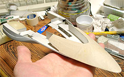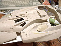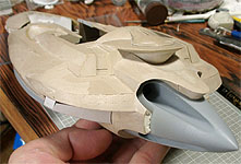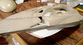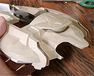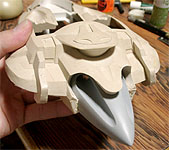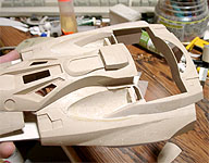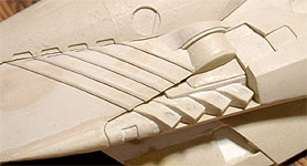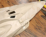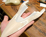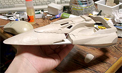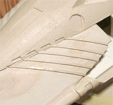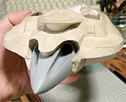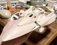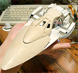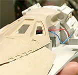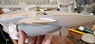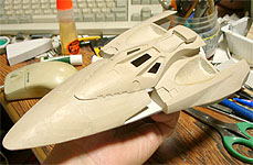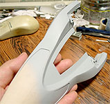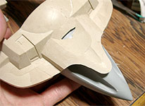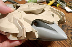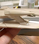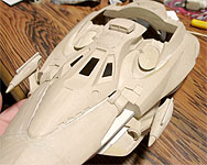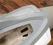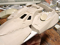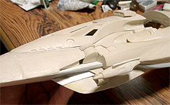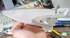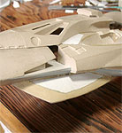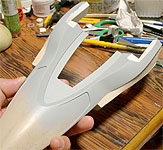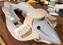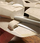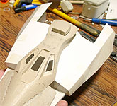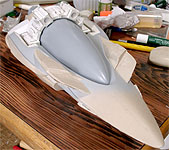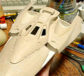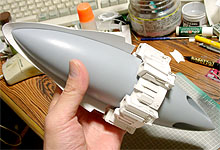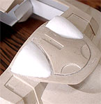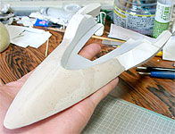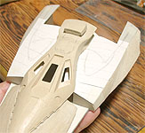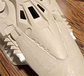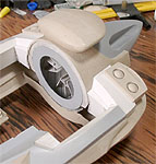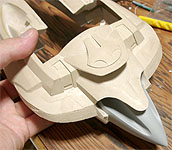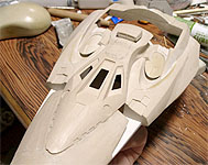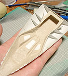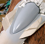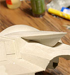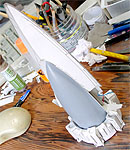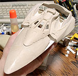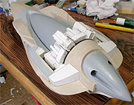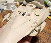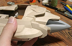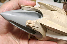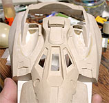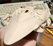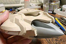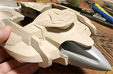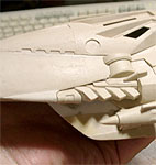 コクピット脇の丸い窪み、脇のギザギザしたところ、その後方の窪み、に細かいディテールを入れるのだが、今のところ全体とのバランスが掴めずにいる。 |