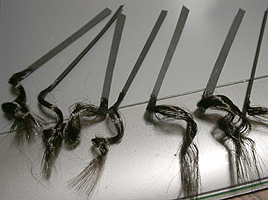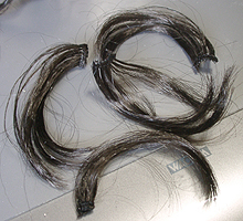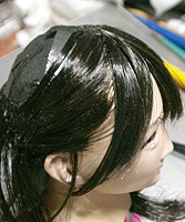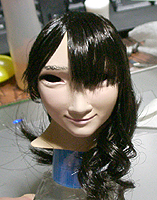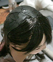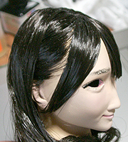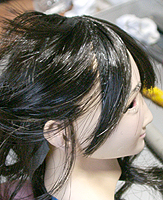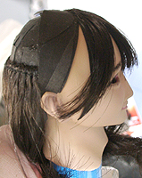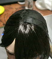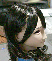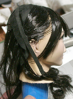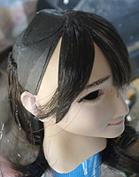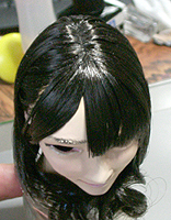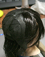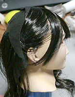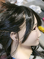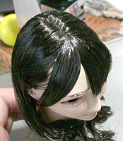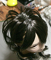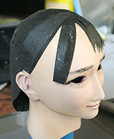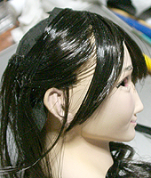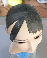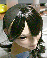 方です。生え際は、毛を、黒い下地よりはみ出させて貼り付け、ナイフの刃で引っ掛けながら毛をずらし、 それっぽくなるように調整します。ほつれ毛は、前髪の縁に接着面を残しておき、そこに橋渡しをします。