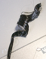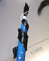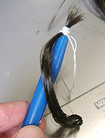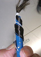 毛を貼り付けますが、ここまでするのにはかなり慎重さと根気がいります。 のりが完全に乾いたら、上から瞬着を染み込ませます。これでもう外れません。あとはひと束ず つ下地に貼り付けていきます。