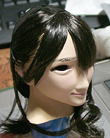 このあと、前髪の調節をしたときに大失敗をして、左の前髪を作り直すことになりました。 相変わらずやっちゃうね、こういうこと。 前髪の先端、目の上を左に向ってカールするのだけど、この状態のままで、この硬い毛を、どうすれば上手 にカールできるか。三つ四つアイデアが出て、全部試した結果、見るも無惨な状態になりました。実験によ る収穫はあったものの、やっちまった感はハンパない。いつものふて寝です。 気を取り直してどうするかと考えていると、横にうっちゃっていた、前に作ったウィッグが目に入りまし た。これ、つかえんじゃね。そのままは無理でしたが、それをベースになんとか、最小限の労力で作るこ とができました。