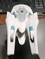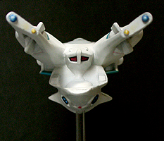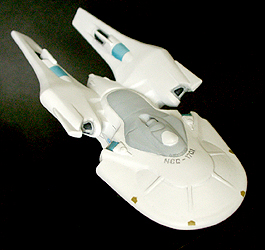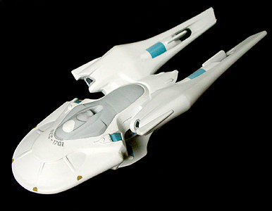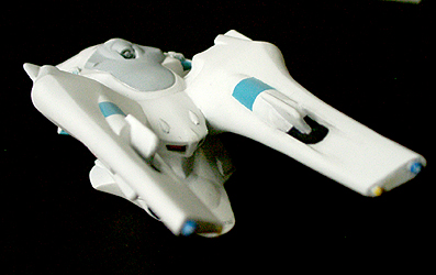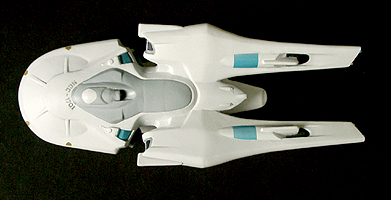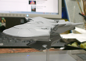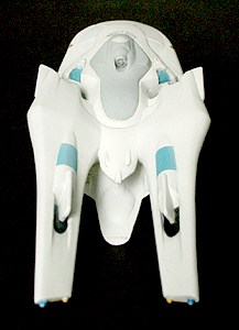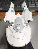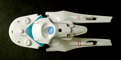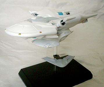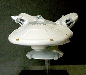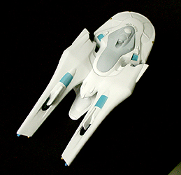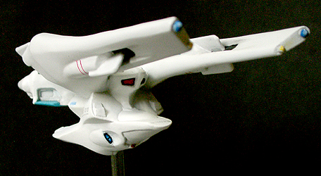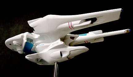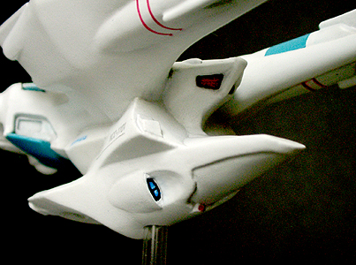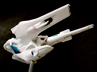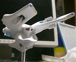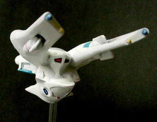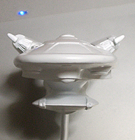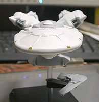 光子魚雷かどうかわかりませんが、円盤下の両脇にあるのが攻撃機関です。円筒形のパーツが一段せり出し発射口があらわれます。一発発射するたびにリボルバーのように発射口がずれます。その他もうひとつ案があり、黒い帯のスクリーンの裏を光の点が徐々に高速回転し、残像が一点に集まり(アニメの原理を見せるトリック映像のやつ)