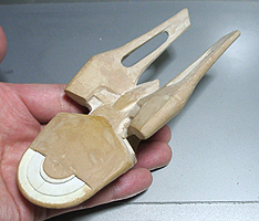 あとは円盤部下の格納庫で、そこに沿って∧字型のウイングを着けたいんですよね。水中翼船みたいに。それがキャラクターになるような感じで。色も別な色にして。今回は擬似的にそれっぽくしてみたが、堂々と着けてみたいんですよね。アニメチックになりそうだが、やり方しだいだと思うんです。てか、今いい考えが思いつきました。∧字型の離脱船にしてしまえばいいんです。惑星上の着陸などは、この船を使えばいいので、世界観とドラマに広がりとリアリティが産まれます。毎度御馴染みのエンタープライズ大爆破もこの船で脱出です。こうなると、メチャメチャ作りたいです。あーでも今回は無理そうです。ん~どうだろう? やっぱムリかな。 |